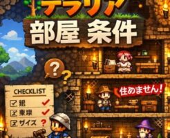 はじめに テラリアでは、NPCを住まわせるために「部屋の条件」を正しく満たす必要があります。しかし実際には、部屋を作ったつもりでも「この部屋は有効ではありません」と表示され、原因が分からず悩む人が非常に多いです。 この記 […]